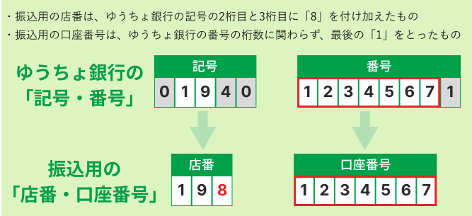 ゆうちょ銀行口座の「記号・番号」によって、店番や口座番号の変換の規則性は異なります。詳しくはゆうちょ銀行のホームページの「記号番号から振込用の店名・預金種目・口座番号を調べる」のページで確認いただくことができます。