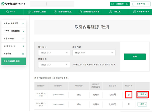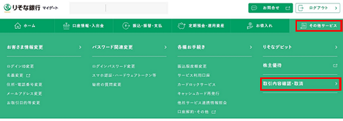 ※スマートフォンの場合、右上の「メニュー」より「その他サービス」>「取引内容確認・取消」をご確認ください。
