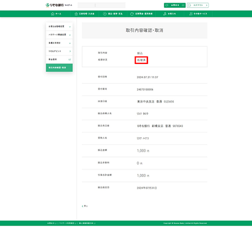 ※「取引内容確認・取消」ページにて、該当する振込が表示されていない場合は、振込が完了していません。確認方法についてはこちらをご確認ください。