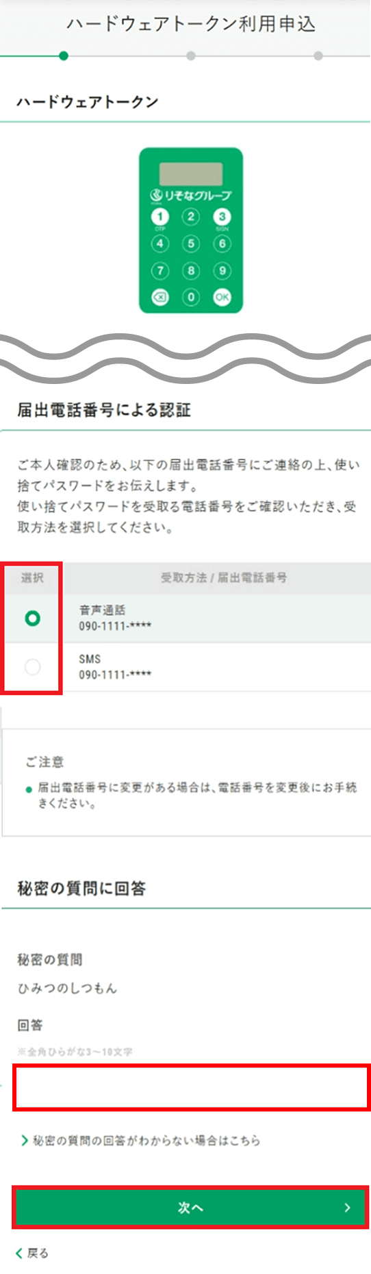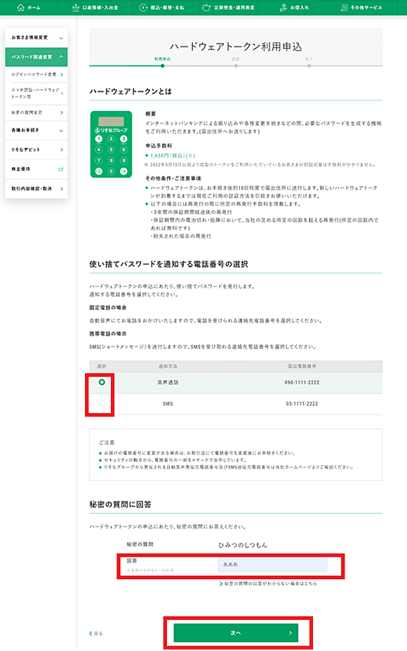 ②使い捨てパスワードの通知先を選択のうえ、秘密の質問を入力し、『次へ』を選択。