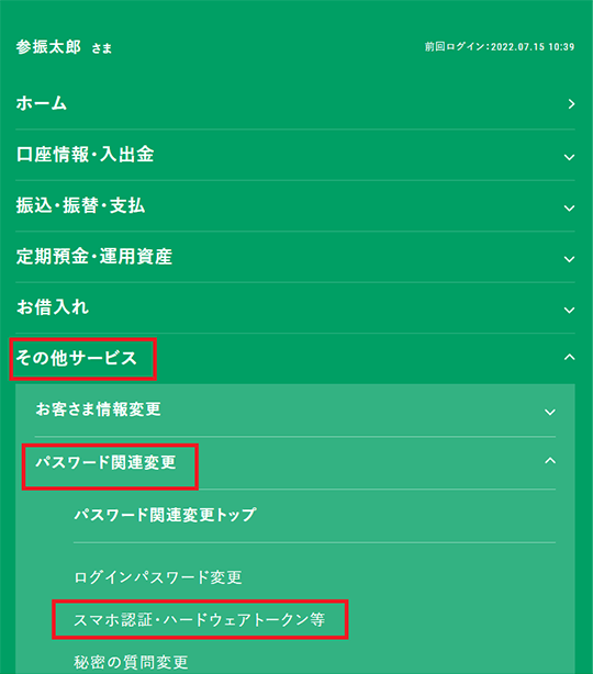 ①マイゲートへログインし、『その他サービス』→『パスワード関連変更』→『スマホ認証・ハードウェアトークン等』→『ハードウェアトークン利用申込』の順に選択。