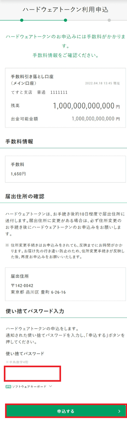 ③ハードウェアトークン発行手数料の手数料引落し口座と金額を確認し、通知された使い捨てパスワードを入力し『申込する』を選択
