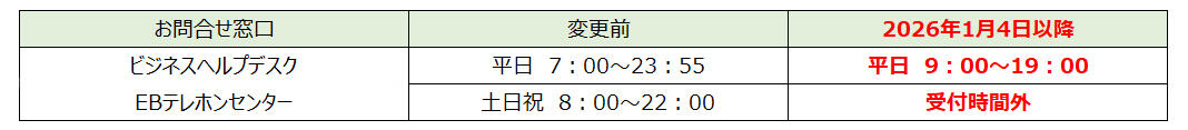 ビジネスヘルプデスク・EBテレホンセンターに関するお問合せ先の受付時間変更のお知らせ