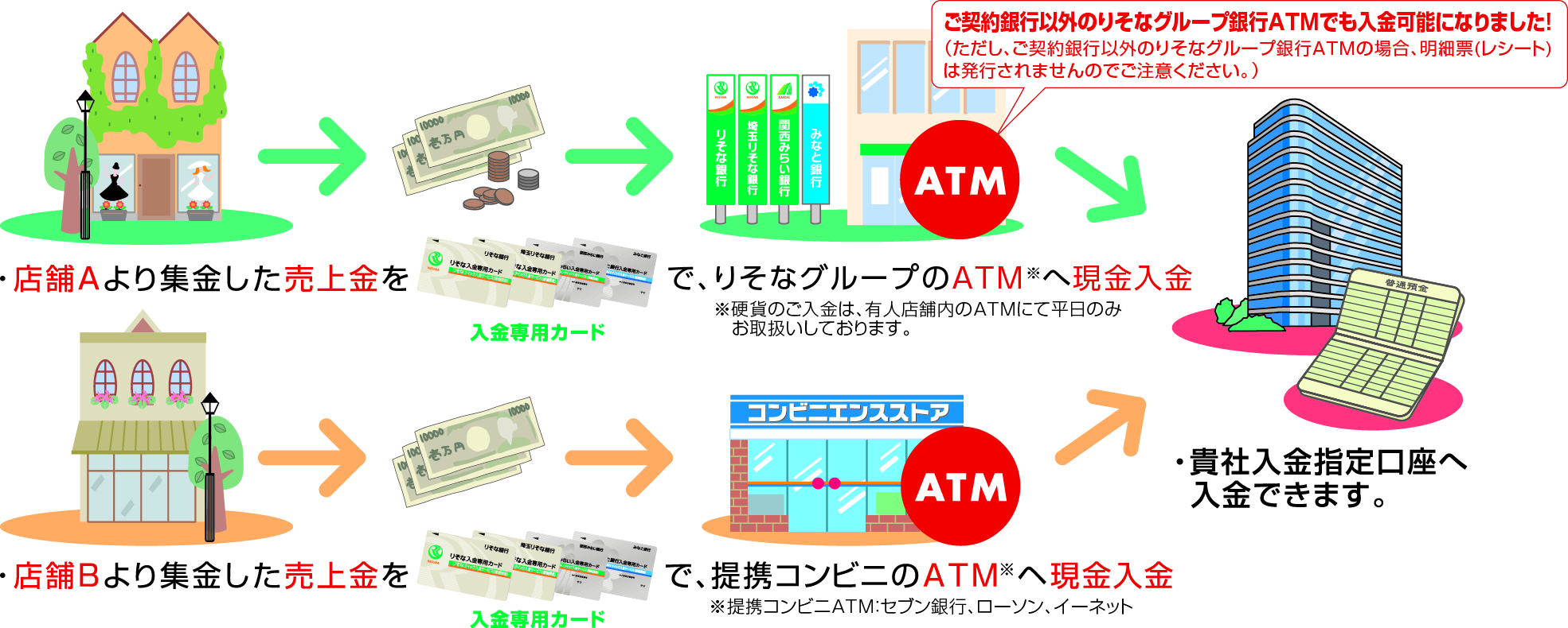 - 入金専用カードを利用して、「りそなグループATM」や「提携コンビニATM」より現金や売上金を集金の都度直接貴社口座へ入金することで、現金保有リスクが軽減できるサービスです。