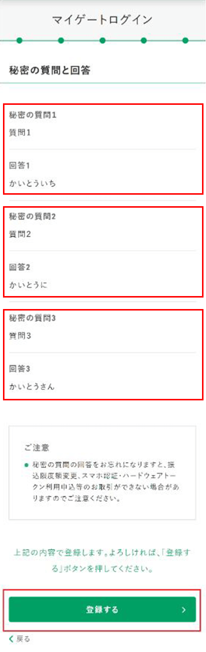 初めてパソコン・スマートフォンからログインする際、3組の質問と回答をご登録いただきます。