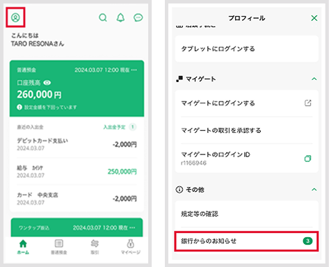 りそなグループアプリの左上の「人型マーク」をタップし、「プロフィール」下部の「その他」内の「銀行からのお知らせ」にてご案内いたします。