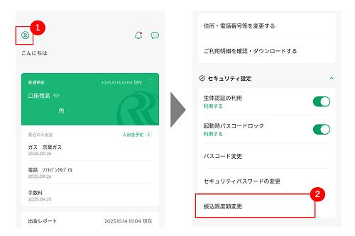 ②「セキュリティ設定」⇒「振込限度額変更」をタップ