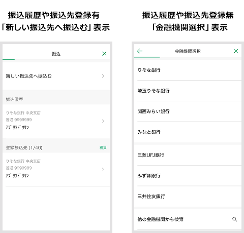 画面上部に「新しい振込先へ振込む」の表示、または金融機関選択画面になった