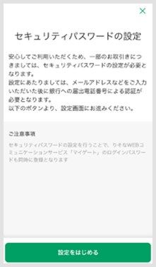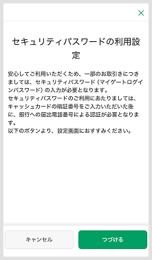 上記画面が表示された場合、セキュリティパスワードは未設定です。画面の案内に沿ってセキュリティパスワードの設定をお願いいたします。