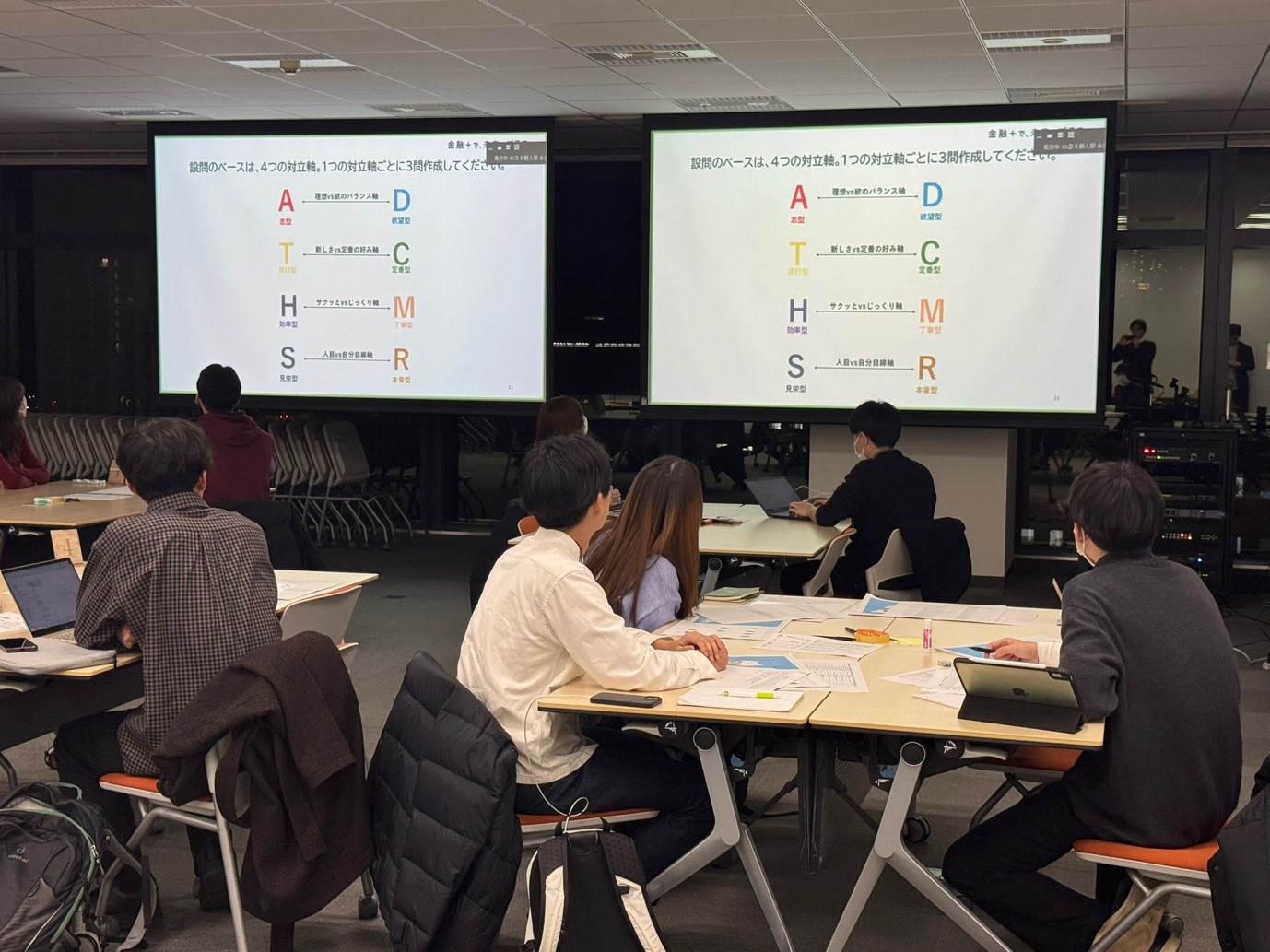 設問文作成のグループは、4つの対立軸それぞれについて3問ずつ、計12問の設問文を考えるミッションに取り組みました。お題は「日常生活のあるある」。共感を呼びやすい等身大の言葉で、誰もが「わかる!」と感じる問いを作ることが求められます。