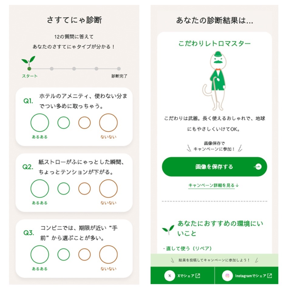 診断の仕組みはシンプル。4つの対立軸(理想vs欲のバランス軸、新しさvs定番の好み軸、サクッとvsじっくり軸、人目vs自分目線軸)に沿って12問に答えると、16種類の「さすてにゃキャラ」のうちの1つに診断されます。自身の診断結果の画像に「#さすてにゃ診断」のハッシュタグをつけてSNSに投稿すると植樹活動に寄付されたり、抽選でAmasonギフト券が当たるチャンスも用意されています。